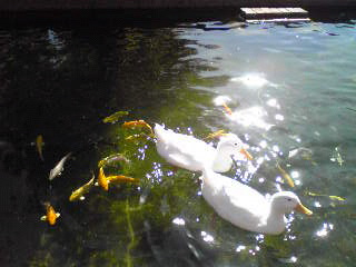 主人が販売機で買った餌をやると鯉とアヒルが寄ってきます。