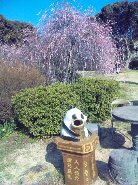 ちなみに、枝垂れ梅の手前のパンダ像は灰皿の様な感じ。