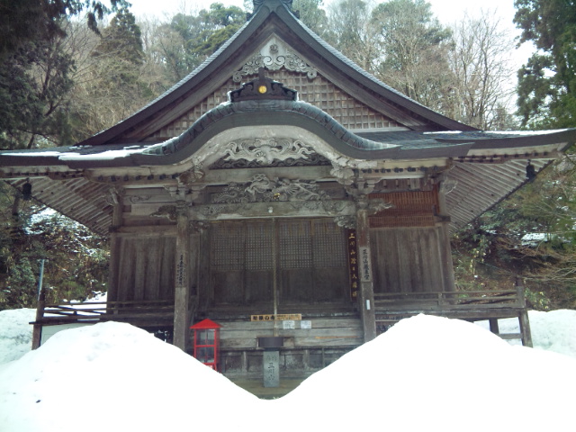 お堂の前の白いものは雪が積もっている状態です。( 一一)