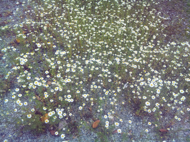 見た目は可憐なカモミールだけど、花壇でも畑でもプランターでも何でもない場所にこの様に大量に生えています。^^;^o^