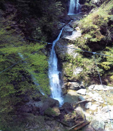 左の写真と右の写真は同じ滝で、左が滝の上側で右が滝の下側です。