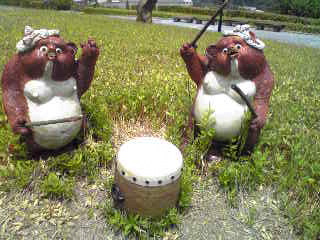 この2枚の写真のタヌキは一つのタヌキ像です。